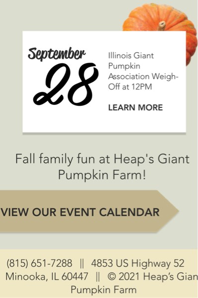 Our Illinois weigh off at Heaps giant pumpkin patch Will be Saturday September 28th All entries Must arrive by 10 AM Starts at noon