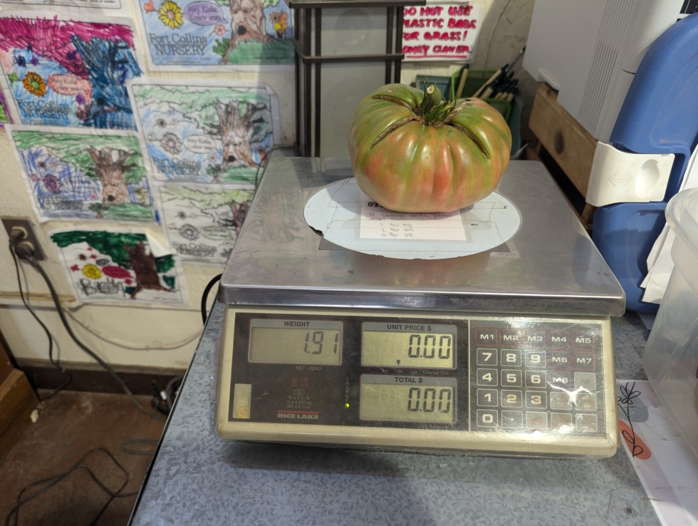 Off to the fort Collins nursery to use their official scale. The first one is the back tomato (surprise tomato) on the 9.06 Brown plant. 1.91 Luers. I guess not bad for something I didn't even know existed until it was a week or two from blushing. :))