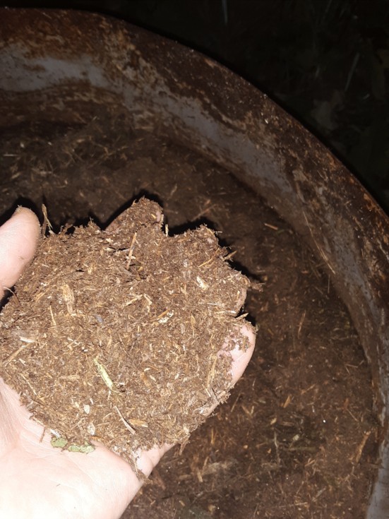 What happens in 1 year... a round bale of hay decomposes enough that it fits into a 55 gal barrel. After I chop it with the lawnmower it becomes this fine soft material. Good food for worms... It might even work as a substitute for peat moss.