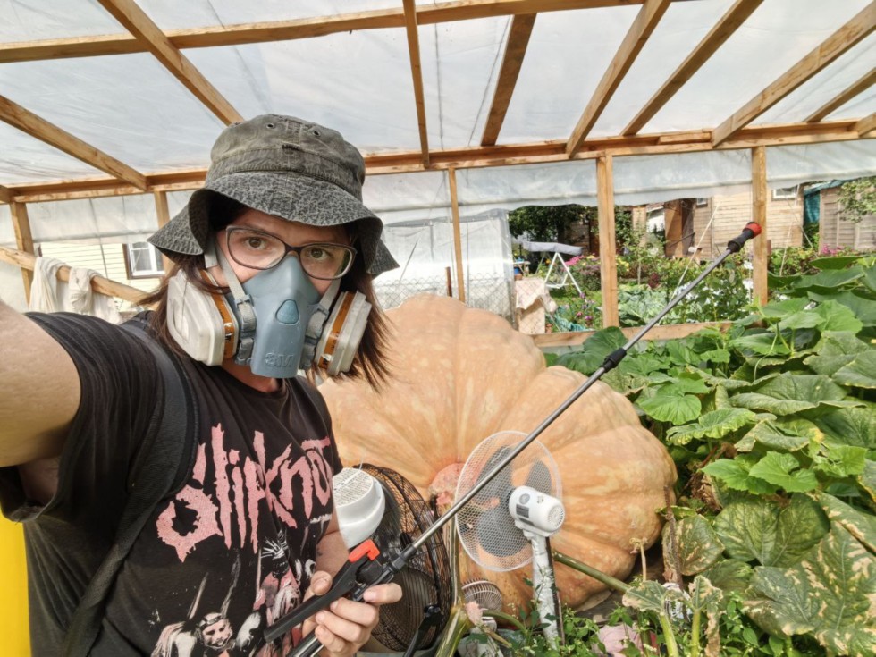 I found a spider mite. It came out of nowhere and started destroying the pumpkin leaves very quickly. I'm using Sanmite to get rid of the spider mite.