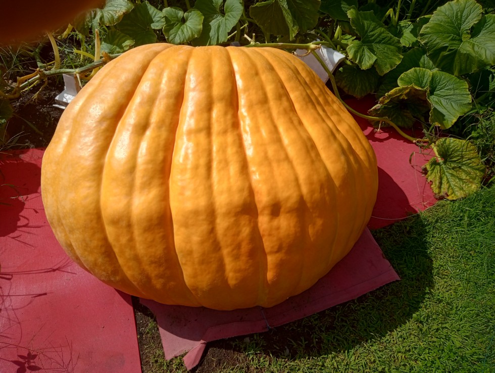 990 Swigert 57 dap in 400 sq ft patch.. Having an awful time measuring this thing because it is growing almost straight up and down and is about 6' across. Side to side measurement being the big issue. A foot differnce depending on which way I pull It. So I settled for a compromise between the two and split the difference. As you can see from previous pics the left upper side has filled out big time. in just five days. Hoping it continues for the rest of the kin. We have a 360 ott..168cc 90 ee..102 ss for 1080 lbs. for a gain of 33 lbs a day. We will let the scales be the judge if she holds together. Not bad for a first year grower in a 400 sq ft patch. Colin and Sheena have done everything I've told them and it's nice just to point a finger.