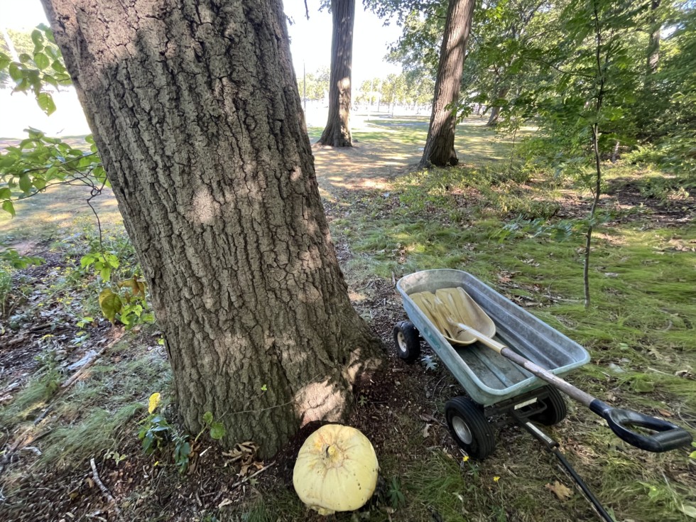 I moved the pumpkin to the edge of the woods in the park. Food for animals. As John Young says, "May she rest in pieces."