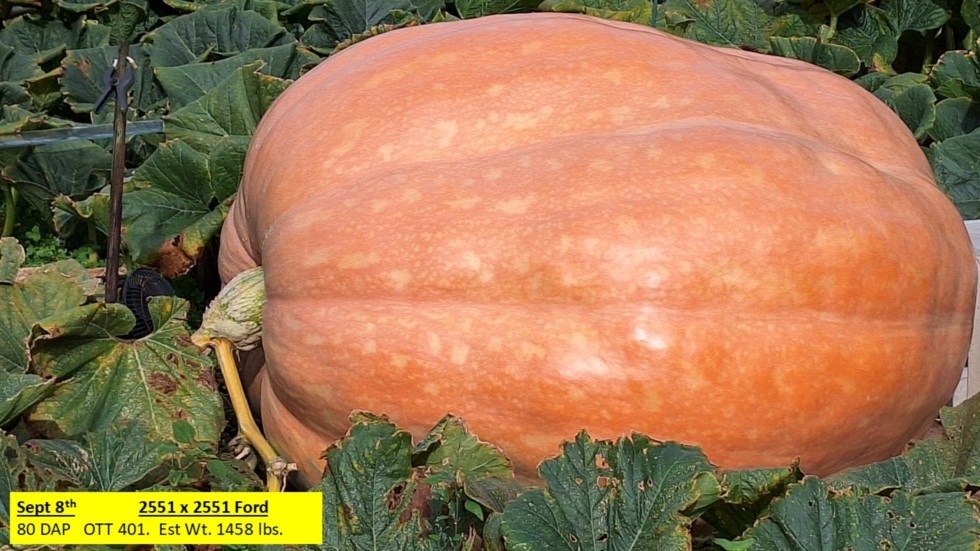 The punpkins are all slowing down to a crawl in weight gain. This is the 2551 x 2551 Ford at 80 DAP. Grown on a side vine after the Deer ate the plants main. For the last 10 days its averaging 7.8 lbs/day. Est weight is 1458 lbs.. 14 days until Harvest.
