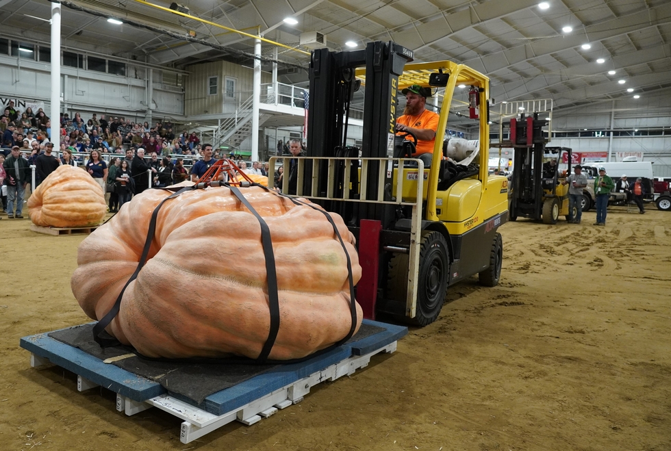 You can see the second forklift in the background getting ready to lift the pumpkin onto the scale.