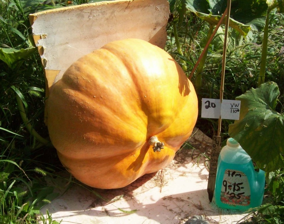 #20. Oh, yeah, the 940.6 Gerry '20. Yep. Seems to wanna grow orange and is always interesting and hardy. Funnel story: There was a funnel spider between the top of the fruit and the piece of insulation that is padding it against the 'no-lean' boards. Guy looking at my fruits one day said "You don't need to move it (the pumpkin). You can leave him alone." Of course, I agreed and later, as I approached the fruit JUST for a walk-though, that spider was on top of the fruit and bolted away once he saw me. He had not ever come up and out like that, before. Makes me wonder (nothing new!), lol. eg ***The final weight was 116.6 (116) pounds.