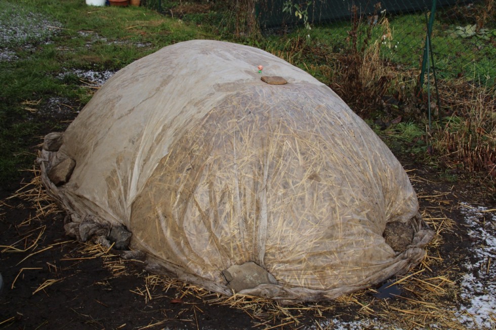 My current compost project...keeping the pile warm for as long as possible. So far, it works nicely, it is frosty outside and still pretty warm inside the compost pile. The 3 inch layer of loosely cast wheat straw and the plastic cover seem to help quite well as an insulation.