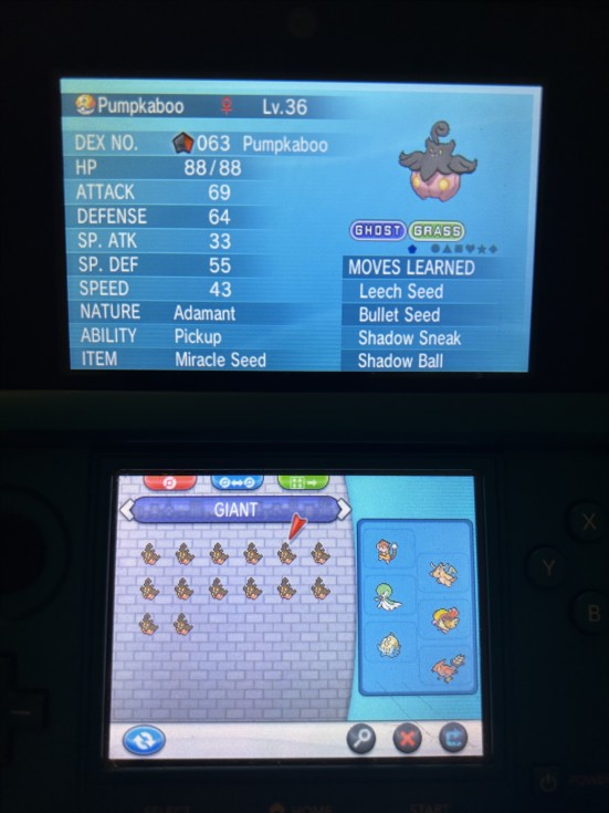 In the game Pokemon X/Y there is a Pokemon named Pumpkaboo. It's a haunted jack-o-lantern/bat creature and it comes in a variety of sizes: small, medium, large and giant. Every time you encounter a Pumpkaboo there is a 1% chance it's giant. It looks like kid Nick liked giant pumpkins too because I caught 14 of them for some reason.