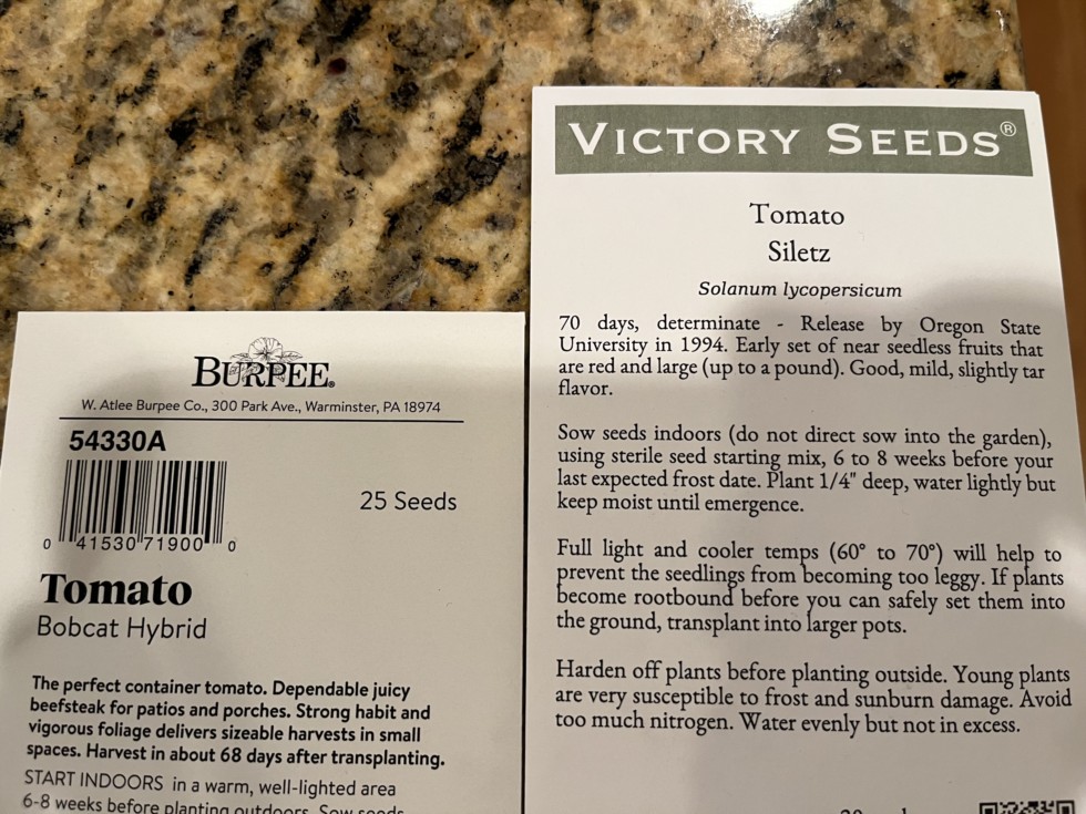 I started some early season determinate tomatoes today. This is an experiment to see how early in the season we can harvest tomatoes. I will grow one plant of each in containers that will hopefully benefit from the microclimate against the west side of the house. They will be brought inside on cold nights.