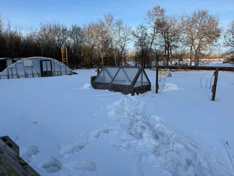 Here we go! Yesterday was -20 but today was only -5 C so I was more motivated to put out the shacks. This is the melon patch and there is a lot of snow.