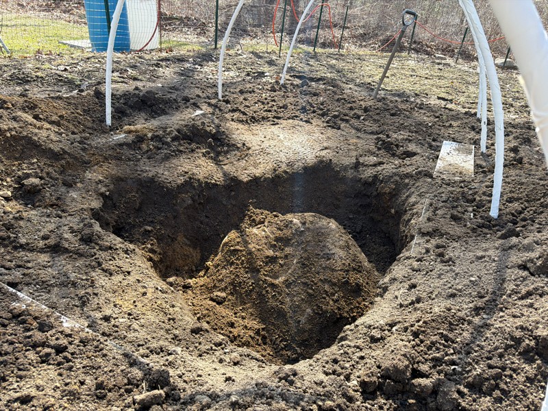 Well this is not good! Found a massive boulder in the patch right where I'll be planting. I have a friend with an excavator that will be coming next week to remove it. Just ordered a delivery of loam for next week to fill this back in. Lots of clay when you get about a foot and a half deep!