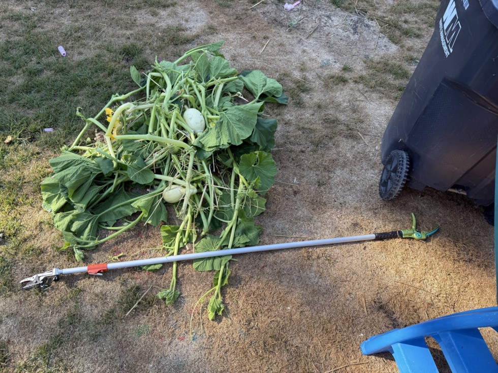 I might have let the plant get away from me the past couple weeks, this is about 2/3 of what I trimmed this morning. I know the math isn't exact, but the 10-15 lbs of growth I pulled could have gone to the fruit.