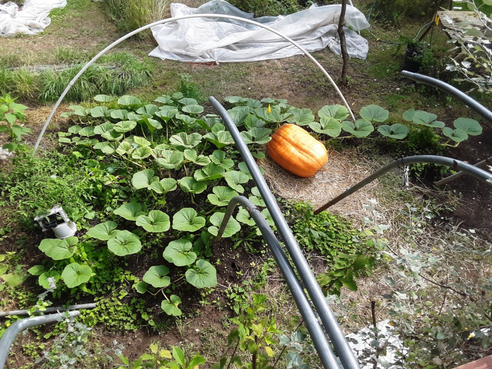 My daughter's pumpkin. In her 150 sq ft patch. Doing well. 1640 Littal x 2054 Strickler.