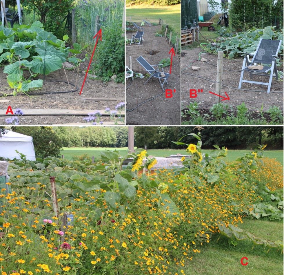 There's not very much going on in the patch right now, but I love my wind protection, which looks particularly nice this year, so, I will tell you about it today. As my patch is located in a valley surrounded by some rather bare hills, cold air comes flowing down the valley at night, and my patch is located at a rather exposed site. Therefore, I've found frost damage in early June in some years, and this year there was some frost damage as early as around August 24th. So, the wind protection is not meant to save the plants from stron gusts, it is meant to pose a hindrance to the cold air flow near the ground. Therefore, I had sown rye and vetch last fall (along the fence around the patch), and that green/purple protector was up in May and early June (when I needed it), cf. pic A, June 11th. Around mid June I chopped it down and (instead of corn, which I used to sow in past years) I planted Zinnias, Tagetes 'Single Gold', and put some corn and sunflower seeds into the ground as well (cf. pics B', B'' from July 1st). Now, the time has come that there's risk of frosty airflow again, but thanks to the flowery fence around my patch (pic C, taken yesterday) the frosty air flow gets disturbed about 5 ft before the patch.