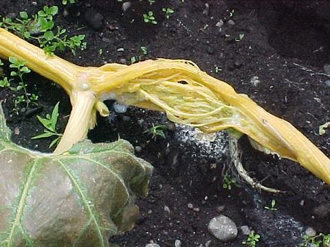 This main vine was mush in my hand when I went to cut it. It collapsed in my hand and my fingers opened it up to this ugly show. Oh man I knew there was problem. The plant further down about 3 ft past this was healthy .The tap roots were in the dirt and feeding 5 more sets of secondary vines