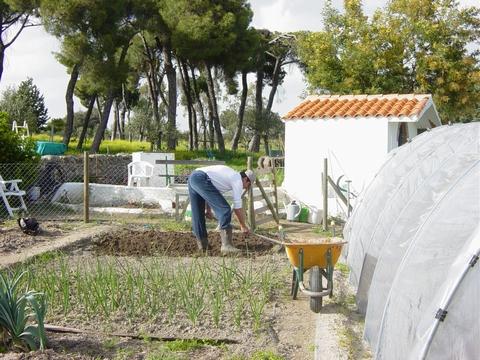 The veg garden is getting dryer, at least, and ready. You can see at the left side of the greenhouse the winter onions, and further is me hand tilling the summer giant onions patch.