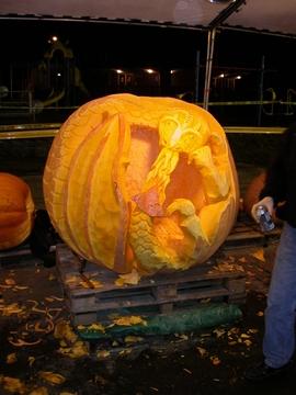 Russ Len sculpted this anorexic dragon from Jim Sherwoods pumpkin. Don't know how he does this while fielding 80,000 questions from the crowd.