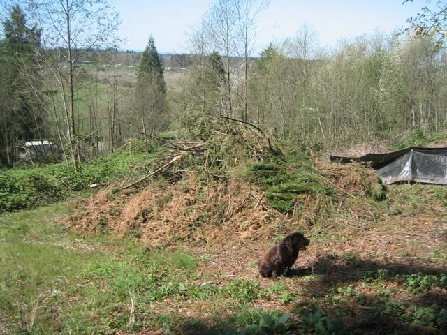 Here is what fell from the trees in that ice storm piled up(Look at earlier photos in my gallery to see the ice storm pictures). The pile is about 8 feet tall and has about a 25 foot diameter. That's Ruger in front of it. This picture doesn't show the size very well even with Ruger in it. It was a LOT of work picking all that up.
