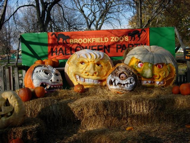 these pumpkins were carved by steve dahlke from chicago the big green on was grown by john barrow 1066 lbs , the one with white hair casey 730lbs , and dave cruzengers 450 pound pumpkin the two were done the folloing weekend and rotted to make it look more scray