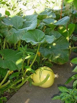 Here is an Emmons x ? that has very conveniently started growing on the concrete path by the patch - very handy. All the others are growig on the old broad bean patch so the pumpkins are suspended on a bed of old bean stalks so do not touch the soil. This is all very 'serendipity'.