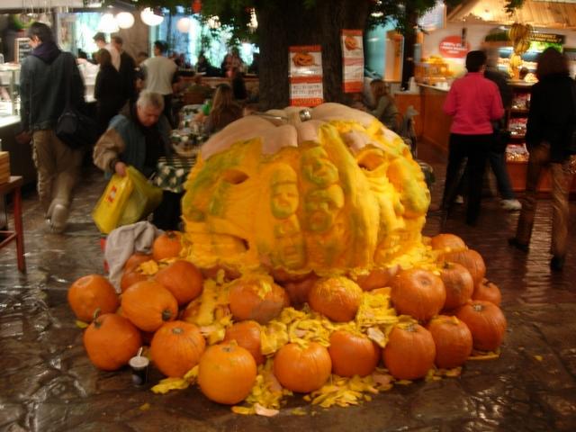 this monster pumpkin took 4 hours to carve two large faces and 6 little faces