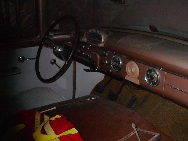 Here is the interior. It has two white bench seats one in the front and the other in the back. When my great uncle purchased this car he did not get air conditioning or a radio. The transmission is a three on the column, but it does have the 272 (4.5L) V-8 motor.