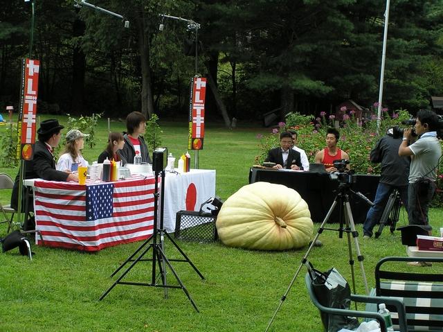 The Japanese and U.S. entrants plus the Announcers await the Pumpkin food, at the Wallaces home. Thats one of Ron's smaller Pumpkins that was picked for the event, on August 21st