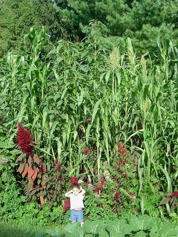 Daughter Ayla standing next to the garden. The tall amaranth is an unknown variety that self-sown in the back of the garden. Plant is about 17 feet tall. Looks like a cross between giant amaranth and some ornamental amaranth.