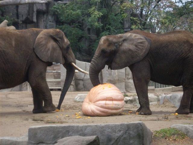 the two elephant came out to discovery this big treat in there pend the one with the tusk placed it tussk into the the giant pumpkin and pulled it apart