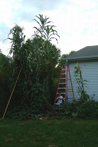 Daughter sitting on a 10 ft. ladder next to some ~21 ft. Tehua maize. This maize isn't standing straight up because it fell for the second time this year. Checked it yesterday and neither plant has a tassle. I trialed this variety last year and saw some positive things. This is the first year I grew it seriously and it's some of the best maize I have this year.