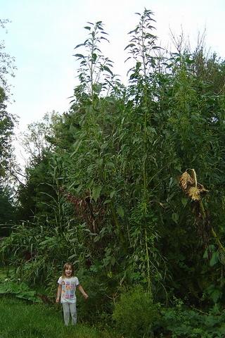 Daughter standing next to some giant amaranth plants. These plants still have quite a bit of growing to do. I don't see any flower buds on these ones yet.