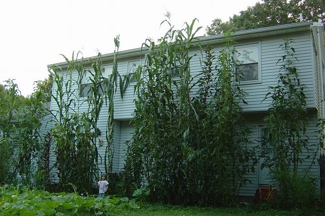 Daughter standing next to giant maize and giant amaranth plants