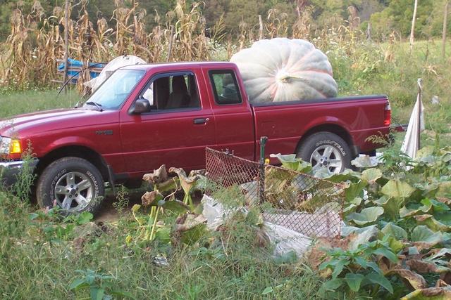 Oct 7 2007 Little Ford Ranger Truck, Big 1402 lb pumpkin,,, tight squeeze but she made it in the back to the trip to Canfield ,,,LOL!!