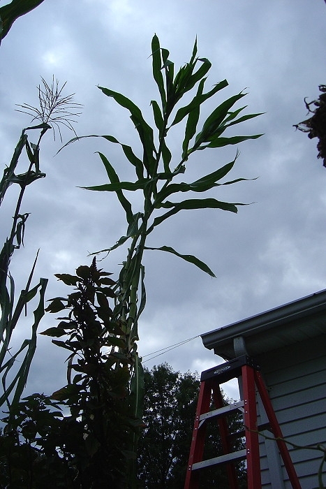 Here is a pic looking up at some Tehua maize from Mexico. Since they are tipping over, my best guess is that the plants are somewhere between 23 and 24 feet. They will probably end up being the tallest plants in my garden this year. Both plants have many leaves at the top. I believe there are at least 6 leaves at the top that have not extended. There are no signs of tassle anywhere on these plants. They are tipping over quite a bit. The top of the plants are approximately 10 feet away from the base of the plant. I have them tied to the garage gutter and some ropes attached to some stakes. I'm leaving them like this because it's helping them get through the windy days not being straight up in the air. This race of maize grows at a snail's pace; so it's depends on when we have our first frost on how tall they will end up.