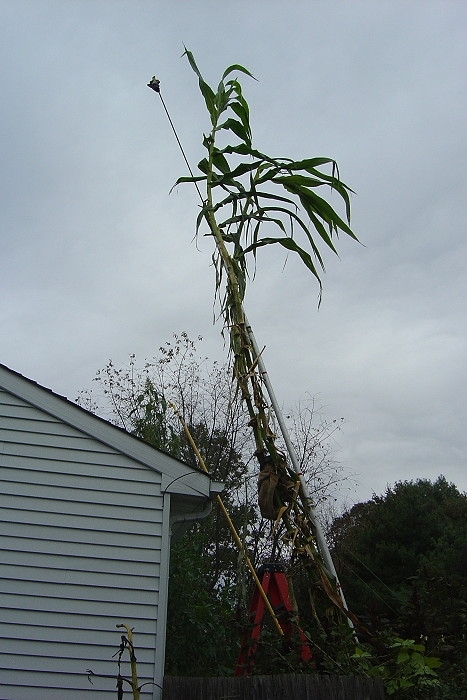 My tallest maize is still growing and doesn't have any tassle yet. It probably has about 6 unextended leaves at the top of the plant that I can count. I put a 27 feet tall pole next to the cornstalk to get an idea of how tall it might be. It's a 21 ft long flag pole with a 6 ft. rod stuck in at the top. The pole is approximately 27 feet. The corn is bent all over the place from all the wind storms, but it looks to be about ~2 feet below the pole from what I can see. It may be less, but it may be more too. I won't know how tall this stalk is until I cut it down and straighten it out as best as I can. It's amazing that the plant is still standing with all the bends in the stem. If I can avoid frost, then I should be able to get a few more feet out of it at least.