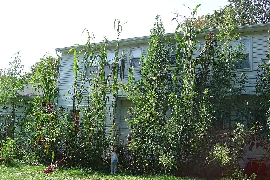 two ~26 feet tall Tehua Maize plants along garage