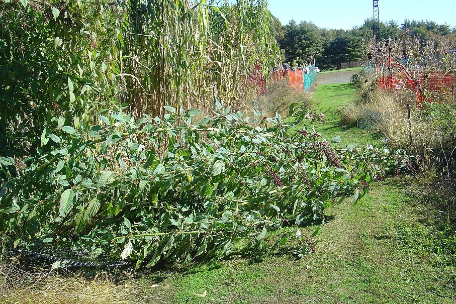 A 22 ft. tall sterile hybrid amaranth (A. hybridus X A. australis) at my garden plot at my job in Princeton, NJ. This is the second one of these that I grew to 22 feet this year. This plant received almost no care and was able to get this tall. It's the only thing that really came out of the garden of any real size. This plant was extremely heavy. Producing many side branches and a large base. Unlike giant amaranths, these hybrids produce stalks that are not hollow or only slightly hollow. This particular plant was most likely the heaviest amaranth I've ever grown. I had a difficult time trying to pick it up. Felt much heavier than any I've grown before.