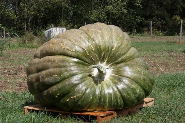 This was the *1004.5Crosby09. The cross was 633Blaylock x 1097.5Beachy. This was the loss that hurt the most, It was growing great and then stopped last of September. We lifted the pumpkin to find a rat had been living under and inside the pumpkin for couple weeks. We used the club scale and weighed it and got the seeds that were left in it out.Went light but that was due to the cavity drying out for couple of weeks.