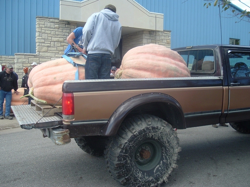 Anamosa grower Dave Zimmerman brought in the biggest pumpkin from Jones County, 1109.9# along with an 800#+ that his daughter grew. If there was an award for the biggest truck, Dave's quad cab, long box, 1 ton 4X4 Ford would have won easily.