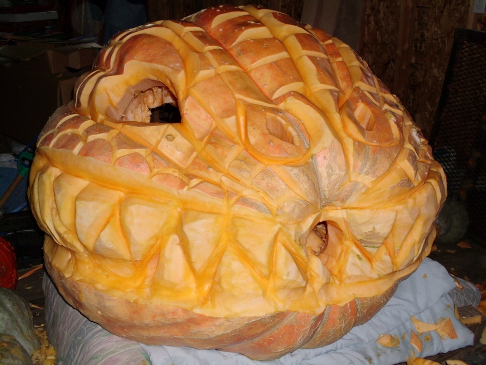 In the Process of carving the 814 Norholm 2010. Todd was kind enough to give me this pumpkin, and I intend to make it look like a Reptilian monster. I call the style Gourdzilla, where the pumpkin is carved on its side, as it naturally sits. It tends to look better with pumpkins that have a snout to them, but it will work on just about any of them none the less.