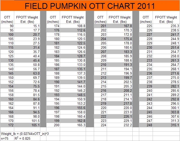The Field Pumpkin OTT table was developed using 75 field pumpkins from the GPC dtatbase and other grower-provided data. OTT over 200" are pure extrapolation as no data was available over 162 pounds. Consider this a beta test version. Comments welcome: [email protected]