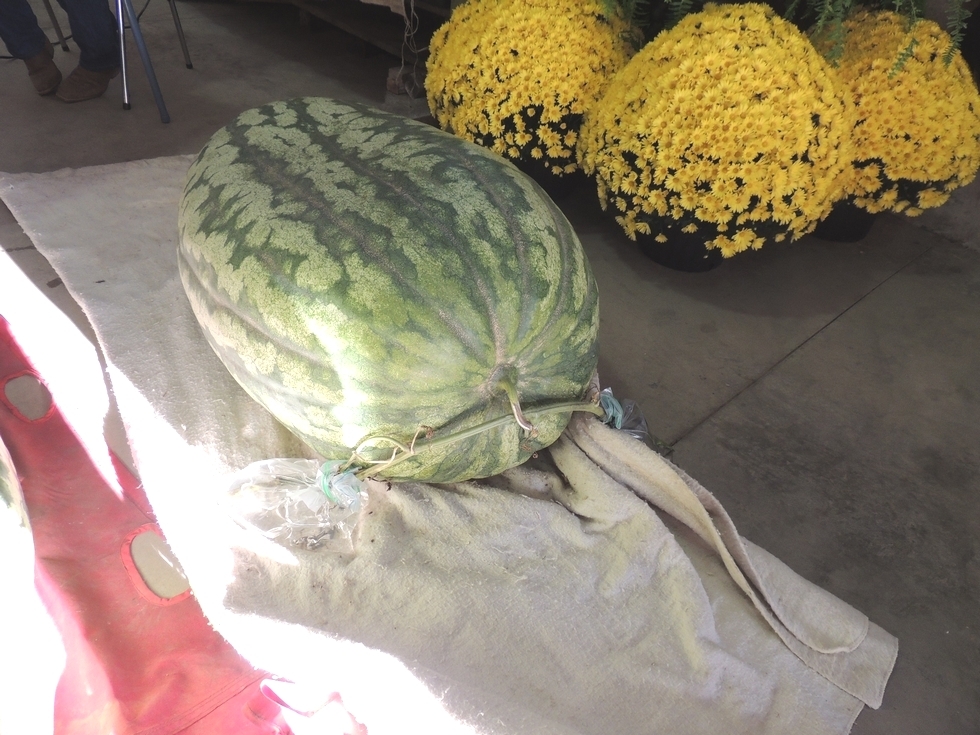 This is Bill Neptune's melon entry at the OVGPG Weigh off. It weighed exactly the same as his melon that he took to Hamilton. And no, it is not the same melon. As you can see, it still has the vines and water bags on it. They did look similar , but had different ott measurements also.
