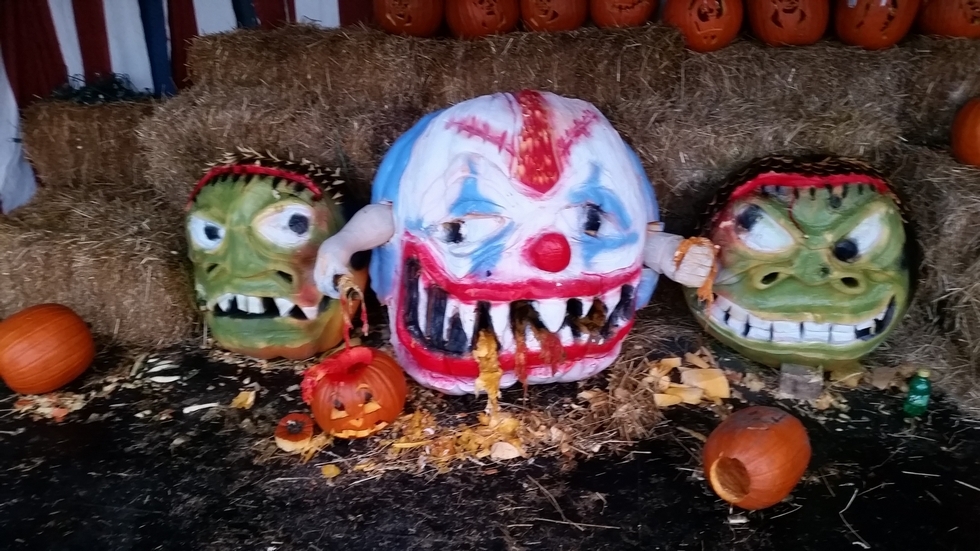this was carve at six flags great America in gurnee il . The creepy pumpkin clown is carving two little pumpkins , while his green monsters are watching .