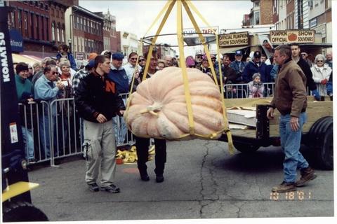 This is how we get our pumpkins to the scales. The harness is put around your pumpkin while it is in the truck then lifted out by forklift. In case you can't tell the weighoffs are right in the middle of town, the town shuts down 4 days for the show......Paul