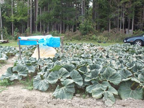 This picture shows more of Len's 910 plant. Notice how dense the plant is and the condition of the leaves. The left of the fruit you can see the space between plants.