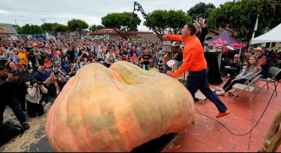 Travis Gienger weighed the his new World Record giant pumpkin in Half Moon Bay, CA at the Safeway World Championship, 2749 pounds grown on the 2365 Wolf and sibbed.
